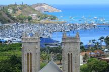 ニューカレドニアの絶景スポットFOLの丘。パンフレットによく載っている景色が見渡せる場所です。セントジョゼフ大聖堂の2つの塔が手前にあり、その奥に洒落たヨットが立ち並ぶポートモーゼルを一望できます。ヌメアの街とヨットハーバーとターコイズブルーの海を一度に眺めることができる場所はここ以外ありません。くっきりとしたターコイズブルーの海を見渡すことができます。