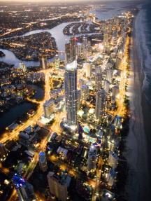 ゴールドコーストを77階の高さから一望できるQ1ビルの展望デッキ。 まるで航空写真のような360度のパノラマが楽しめます。