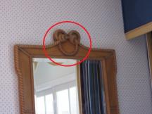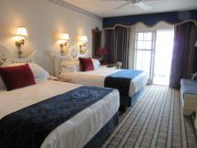 スタンダードルームのドアやベッド、鏡、チェストなどは船内にいるようなイメージで、ベッドボードは船の舵の形になっていてかわいらしいのですが、シックなブルーと赤でとても洗練され、全体的に高級感のあるインテリアになっています!クイーンベッド2台とプルダウンベッド(ソファの背を引っ張るとシングルベッドになる)が1台あり、最大5名まで宿泊が可能です。お部屋によって異なりますが、バルコニーがあるお部屋もあり、外の景色を見ながらゆっくりくつろぐのもおすすめです。また、お部屋へ向かう廊下の絨毯やクッション、ベッドカバー、鏡台、シャワーカーテンなどにも隠れミッキーがいるので、ぜひ探してみてくださいね!