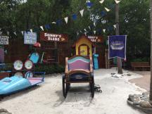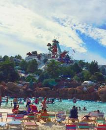 常夏のフロリダに突然の大雪が降り、大急ぎでジャンプ台や大回転のコースを造ってフロリダ初のスキーリゾートが誕生!しかし太陽が戻ってみるみるうちに雪は解けてしまった・・・それならば、ウォーターパークにすればいい!そんなおもしろいストーリーが元となっているのが、ここ、ブリザード・ビーチです!パーク内にはスキーグッズや、グーフィーがジャンプ台から滑った際にできた穴なども目に入ります。移動にスキーリフトを利用できるのもユニーク!