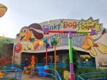 トイ・ストーリーランドには新しく2つのアトラクションが登場ました!1つ目は「スリンキー・ドッグ・ダッシュ」というファミリー向けのジェットコースター。体がバネになっている犬「スリンキー・ドッグ」のバネを伸ばしたり縮めたりするイメージで急発進・急旋回します!夜はコースターのレールやランド内がライトアップされ、昼間とは違った景色も楽しめます。ぜひ昼と夜2回乗ってみてください。