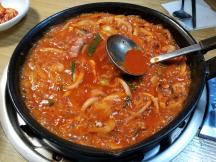 蓋を取って煮え具合を確認したらかき混ぜて、真っ赤になってきたナッコプセを器によそっていただきます。