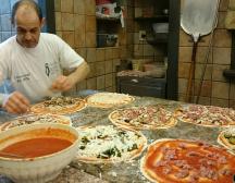 入り口に入ってすぐ左手に、ピッツァを焼く窯があり、その手前の石材のカウンターで、職人さんたちが生地をのばしてトッピングをしている様子が見られます。その生地の薄さにびっくり!こんなに薄くのばすのは、本当、職人技です。
