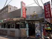 タッカンマリとは、タッ(鶏)ハンマリ(一羽)を茹でただけのシンプル料理。とは言っても、冷凍しない鶏を使って、下ごしらえには十分気を使っているので、火が通ってもプリプリ感があって非常に美味しい。つけダレは「タデギ」と呼ばれる自家製ヤンニョム(薬味)に醤油、お酢、からし、ニンニク、ニラをあえたものをお店の方が作ってくれる。これがちょっぴり辛くて、またクセになると評判の味。