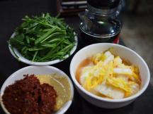 タッカンマリの他にテーブルに出されるのは、タッカンマリ調味用のニラ、タレ、唐辛子ベースの薬味に水キムチです。