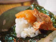 ご飯の上にキムチチムをのせて食べてもいいし、海苔でキムチチムとご飯を包んで食べるのもオススメ。