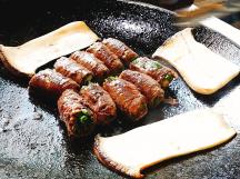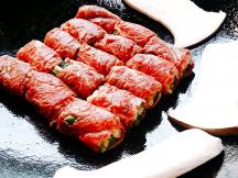わけぎとセリ、エゴマの葉を「韓牛」の薄切り肉で巻いた料理がマリコギです。