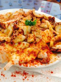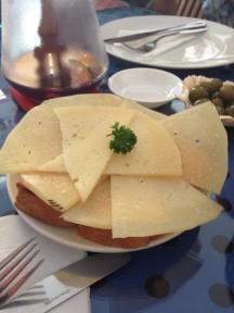 パン・コン・トマテという、パンにニンニクとトマトをすりつけてトーストしたものにマンチェゴチーズと言う味わい深いセミハードのスライスチーズを乗せた料理は、ワインや自家製サングリアのお伴に持ってこい。チーズってこんなに旨味があるものだったのだなと、改めて実感できます。
