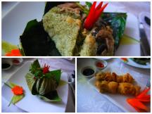 「チキンライス蓮の葉包み」(139,000ドン、およそ750円)と、「もろく揚げ野菜」(79,000ドン、およそ425円)を注文。おこわが蓮の葉で包まれており、開くと鶏肉、蓮の実、しいたけ、これらの具が良い香りを漂わせる。蓮はベトナムの国花で、現地の料理にもよく使われる。見た目にも美しく、もちろん味も美味しい。