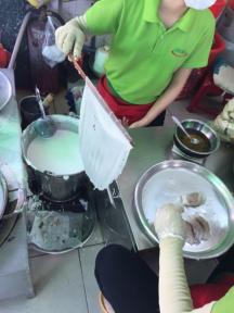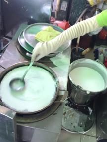 ただ作るのがとても大変。米粉を水で溶いた生地を用意し、それを専用の大きな円形の蒸し器に伸ばし、一枚一枚蒸し上げていきます。蒸し上がったら破らない様、器用に棒と手を使って蒸し器からはずし、具材を巻く専門スタッフに渡します。