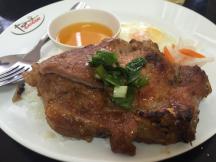 特にお勧めしたいコムタムメニューが、こちらの豚肉のタレ焼き。お昼時が近づくと街の至る所、道路の脇やお店前の歩道などで炭火を起こし、タレに漬け込んだ分厚い豚肉を香ばしく焼いているのですが、この臭いがもうたまらない!