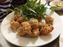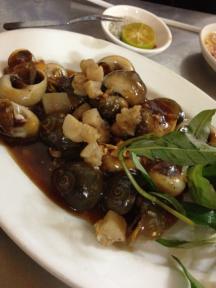 いきなり変わった物に行くのは勇気が要る、という方にはハマグリのレモングラス蒸し(55,000ドン・約280円)がアサリの酒蒸しの様で食べ易くもあり、且つレモングラスの南国チックな風味もありで食べ易くておススメです。日本ではまず食べられそうにないと言う点では、巻貝のココナツミルク炒め(50,000ドン・約250円)がとてもおススメ。縦長の巻貝の細くなっている方が切り落とされているので、そこからチュッと身を吸って頂きます。貝ってこんな風にも料理できるんだ、という驚きを楽しんでもらえるかと思います。