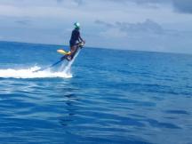 ジェットベイターとは、水上バイクの水圧を利用して水面をホッピングしながら進む、まるで“空を飛ぶバイク”といった感じのマリンアクティビティでサイパンでは最新のアクティビティのひとつ。