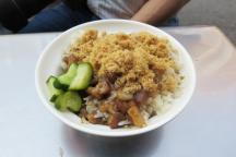 その隣には、米糕(ミーガオ)が看板料理「木西米糕店」が並んでいます。米糕はおこわご飯に魯肉と豚肉そぼろをのせ、きゅうりがトッピングされています。小さなお碗で30元。とても小さなお椀なので、これに魚のすり身団子が入った貢丸湯(25元)や漢方スープの四神湯(30元)を一緒に頼むとちょうどいい量です。