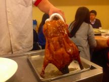 目の前で出来たてのダックを、見事な手さばきで切り分けてもらえます。出来たてダックの皮はパリパリで、