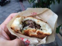 焼きたての胡椒餅は固めのパン生地の中に、葱と豚肉の餡が入っており、名前の通りピリリとした胡椒が効いています。