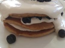 三段重ねのパンケーキの間に黒糖タピオカが挟まれて、上からタップリのクリーム。