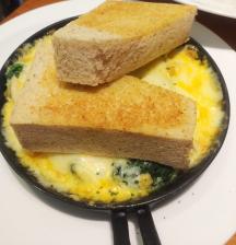 一見物足りないかもしれませんが、あつあつのフライパンにしらすとほうれんそう入りの卵焼きを載せ、焼きたてのガーリックパン2枚が付いて、かなりお腹がいっぱいになるボリュームです。