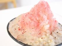 薄いピンク色のシロップがかけられていて、かわいらしい雰囲気のかき氷です。バラの香りがする新しい味で、おいしかったです。