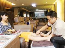 足ツボマッサージではまず足湯。殺菌効果が抜群で不純物がなく安心な天然の海塩を使ったお湯に足をつけてリラックス。同時に肩と首のマッサージをしてくれます。その後、高級ブランドのクリームを使ってマッサージ。乾燥したお肌に潤いが戻ってきます。