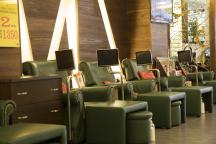 お店に入ってすぐ目に留まったのはズラッと並ぶゴツイ黒皮張りの椅子たち。全てわざわざドイツからやってきたジャグジー式足湯ソファーなんだそう。