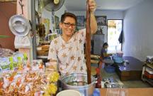 駐車場から海までの路地には、お土産物屋さんが軒を列ね、もち米の粉とココナッツミルクを煮詰めて作ったサムイ島名物「ココナッツキャラメル」や、サムイ産ココナッツを使った「天然ココナッツオイル」や、ココナッツアイスクリームなども売っています。