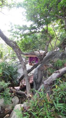 自然を崩さないように作ってあるので、東屋のすぐ横が大岩だったり、シャワールームは大岩を上手く利用して作ってあります。スパの装飾も椰子殻ランプやタイ南部特産の木製の鳥かごなどナチュラルなものを控えめにかざってあり、傾斜には蘭が植えられていたり自然と調和したスパになっています。
