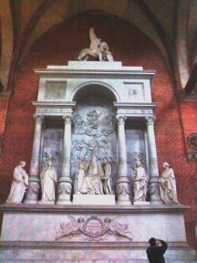 サンタ・マリア・グロリオーザ・デイ・フラーリというたいそうな名前の教会ですが、ベネチアではサンマルコ寺院と並んで重要な教会で、内部には歴代のベネチアの国家元首の墓碑も多く造られました。また、ティツィアーノの最高傑作「聖母マリア被昇天」が主祭壇に据えられています。また、ティツィアーノや19世紀始めの彫刻家アントニオ・カノーバのお墓も造られました。