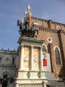 この教会が建つ広場にある馬に乗った人物の彫像は、ヴェネツィア共和国に仕えた傭兵隊長であった「バルトロメーオ・コッレオーニ」の銅像で、レオナルド・ダビンチの師匠であったヴェロッキオ作。ルネッサンス期の騎馬像の傑作と言われています。