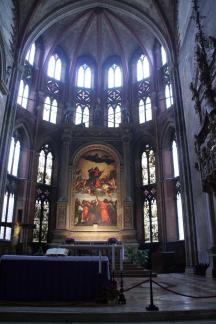 聖歌隊席を抜けた先の主祭壇を飾るのが、サンタ・マリア・デイ・フラーリ教会の至宝、ティツィアーノの『聖母被昇天』(1518年)です。 天に昇る聖母マリアの晴れやかな姿とそれを崇めるように見上げる使徒たち、そして聖母を迎える天なる父の姿。祭壇画の前に立った当時の人々は、周囲をぐるりと囲むステンドグラスの光によって浮かび上がる、壮大なドラマの一シーンに立ち会っているかのような気になったことでしょう。