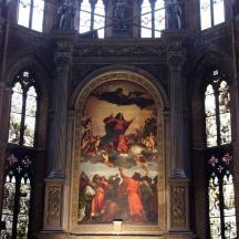 『聖母被昇天』は金のアーチの縁どりや大理石の柱の枠、そして何より周囲のステンドグラス(から差し込む光)と一体となった、この場所、この教会から決して切り離してはいけない絵画です。私たちもその壮大なドラマに立ち会うために、当時の人たちと同じように足を運び、祭壇画の前に立つことにしましょう。