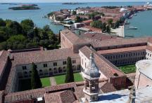 教会内部を見学した後は、祭壇奥のエレベーターで鐘楼に登りましょう。サン・マルコ広場の鐘楼よりサン・ジョルジョ・マッジョーレの鐘楼がおすすめなのは、海に浮かぶヴェネツィアとイタリア北西部のドロミテ山塊までを望む絶景と、(サン・マルコの鐘楼からでは見えない)サン・マルコ寺院やデュカーレ宮殿を眺望することができるからです。細い小路と運河と、それをつなぐ太鼓橋のヴェネツィアとは違う、解放感にあふれたヴェネツィアを堪能しましょう。