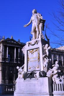 リング通り沿いにあるモーツァルト像が建つ緑豊かな公園に立ち寄る。背景の王宮もとてもきれい。ウィーンらしさを感じられる記念撮影ポイント。