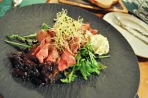 お勧めメニューはしっかりと赤いローストビーフ(14.8ユーロ)! 薄くスライスしてあってワインにもよく合い、サラダも付いているのでさっぱりと楽しめます。他にもビーフタルタルや、フルーツやナッツが一緒に乗ったチーズ盛り合わせなど、お酒によく合うおつまみ系メニューも揃っています。ひとつのお料理はそれほど大きくはないので、色々なお料理を注文して楽しめるのも居酒屋風で嬉しいですね。