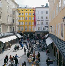 ゲトレイデガッセと、Hagenauerplatzに面しているモーツァルトの生家(画像提供:©Tourismus Salzburg)