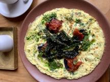 ポテトオムレツ(15ドル)。薄めのヘルシーなオムレツで、揚げたケールがトッピング