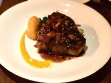 仔牛のポーターハウス(46ドル)。ポテトコロッケが添えられ、マッシュルームのソースがかかっています