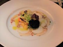 前菜、タコのモザイク(20ドル)。タコのカルパッチョとして特徴的な一品
