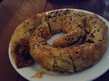 メインのおすすめは、「クレアトピタ」(14ドル)。これは、ギリシャ・スコペロス島名物のミートパイで、ミンチ肉やサガナキチーズを詰めたパイ生地を蚊取り線香のようにグルグル巻きにし、黒ゴマをまぶして焼いたもの。肉とチーズのハーモニーが絶妙で、香りも良く、ボリュームたっぷりの一品です。数人でのシェアにぴったりです。