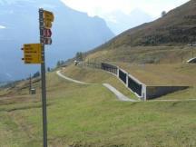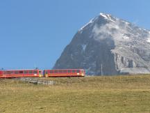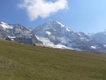 まず駅舎のあるホームの線路を横切り、線路脇の幅の細いコースに入ります。ちょうどユングフラウやメンヒを目指して進む形。牧草地帯の中をしばらく進むと、アイガーやメンヒをバックにユングフラウを目指す登山電車が行き交います。雪に覆われた山、緑の牧草、青い空の中で、赤い車体がひときわ目立ちます。