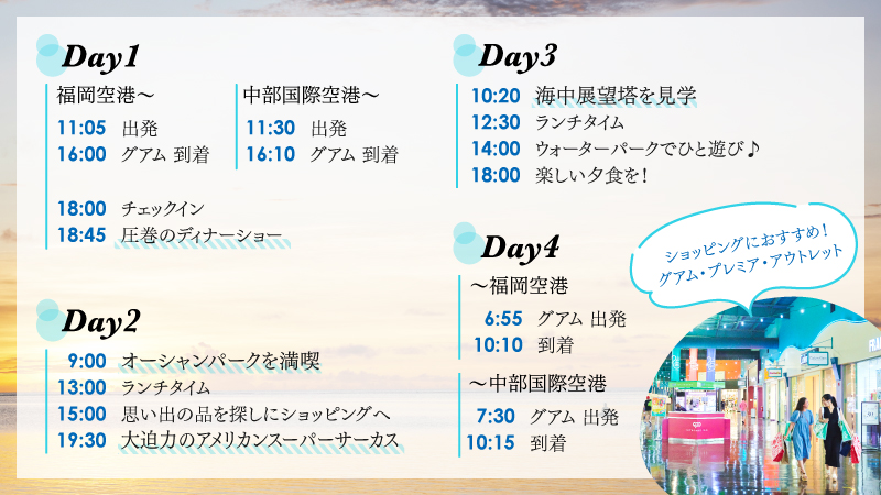 名古屋(中部)、福岡からもそれぞれ1日1便、直行便が運航しています。家族と特別な時間を過ごすなら3泊4日がベター◎ グアムの自然や文化に触れて、大人も子供も楽しめるとっておきのコースをご紹介♪