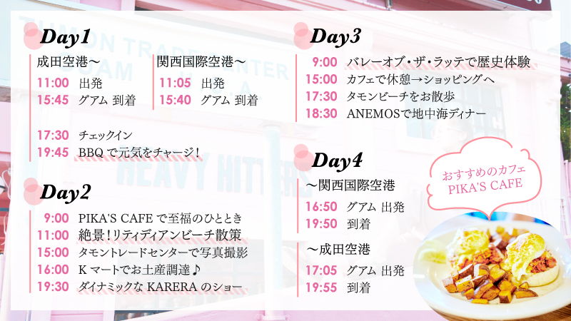 曜日によりますが、成田、関空からは複数便が就航していて、時間帯のアレンジしやすいのが◎。 ぜいたくな時間を過ごせる3泊4日のスケジュールを徹底解剖! リッチな非日常を体験して心も体もリフレッシュしよう♪