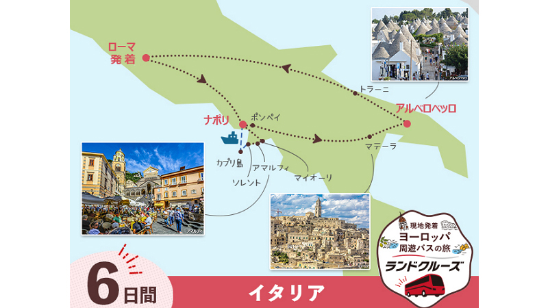 イタリアは南北でふたつのコースがあります。ここでは、ナポリやアマルフィなど人気の絶景スポットを巡るイタリア南部ルートをご紹介。イタリア北部ルートならメインの行き先は、ローマ→フィレンツェ→ミラノ→ベネチア→ローマで、イタリア観光の代名詞といえる都市を訪れます