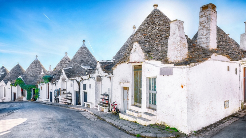 「トゥルリ」と呼ばれる白い円錐形の屋根を持つ建物が建ち並ぶ、ユニークな街並みが特徴。ファンタジーの世界に迷い込んだかのような景色が広がります。トゥルリが密集する旧市街には、お店やレストランが集まるエリアと居住エリアが分かれていて、観光しやすいのもポイント◎