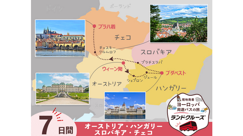 オーストリア→ハンガリー→スロバキア→チェコの順に4カ国をめぐる大満足のコースです。ここでは、オーストリアのウィーン、ハンガリーのブダペスト、スロバキアのブラチスラバ、チェコのプラハに焦点をあててご紹介します♪