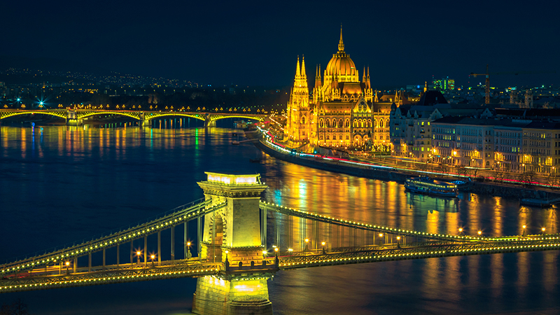 「ドナウの真珠」と称えられる、美しきハンガリーの首都。ドナウ川に鎖橋が架かり、王宮を擁する西岸の「ブダ」と商業で栄える街「ペスト」が結ばれ、後に「ブダペスト」となりました。ライトアップされたブダ城や国会議事堂の姿は圧巻です