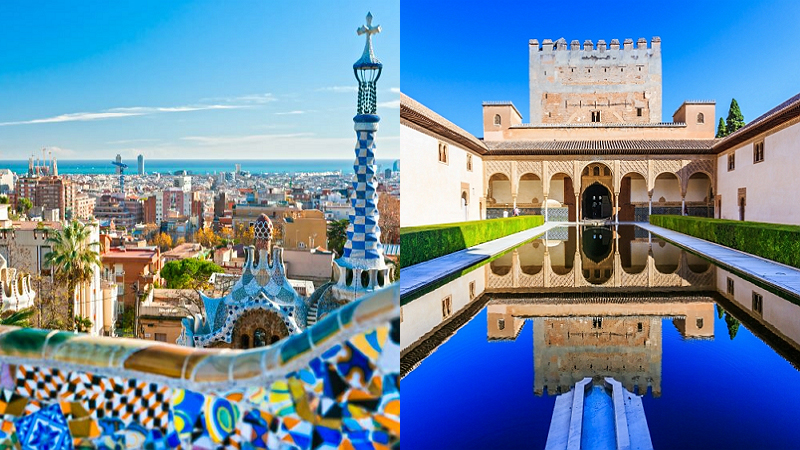 左)グエル公園、サグラダ ファミリアなどアントニ・ガウディ建築が建ち並ぶバルセロナ。右)世界遺産のアルハンブラ宮殿を擁し、イスラム文化の面影を色濃く残すグラナダ