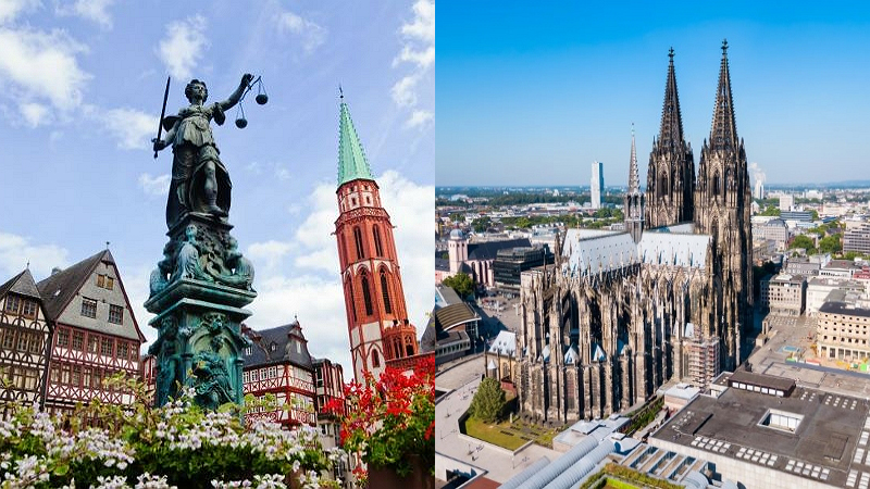 左)近代的な街並みと歴史ある旧市街が共存した街、フランクフルト。名物のソーセージはぜひご賞味あれ。右)ケルンでは、世界最大級のゴシック様式建築である大聖堂見学も付いています♪