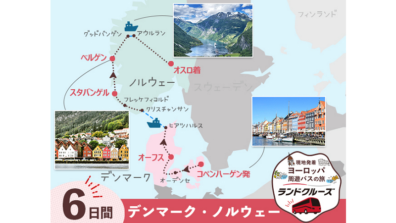 昨年新設された、人気上昇中のコースです。デンマークからノルウェーへの船移動はもちろん、世界自然遺産のフィヨルドのクルーズも込み! 自力で手配すると難しいルートも、ランドクルーズなら一気に巡れます◎