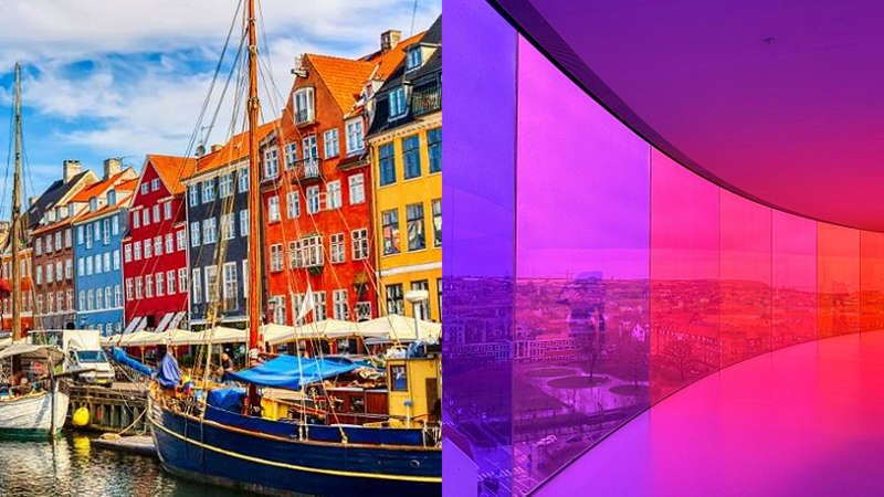 左)デンマークの首都、コペンハーゲンで特に有名なのは、ニューハウン。カラフルな建物が並ぶ運河沿いの港をぜひカメラに収めて。右)第2の都市オーフスにあるアロス・オーフス美術館では、デザイン大国の真髄に触れられます